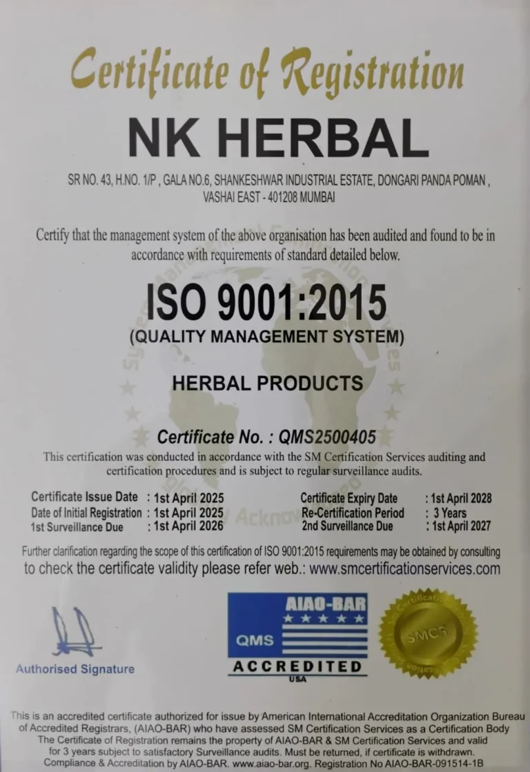 NK Herbal holds ISO 9001:2015 certification, which applies to our quality management systems.